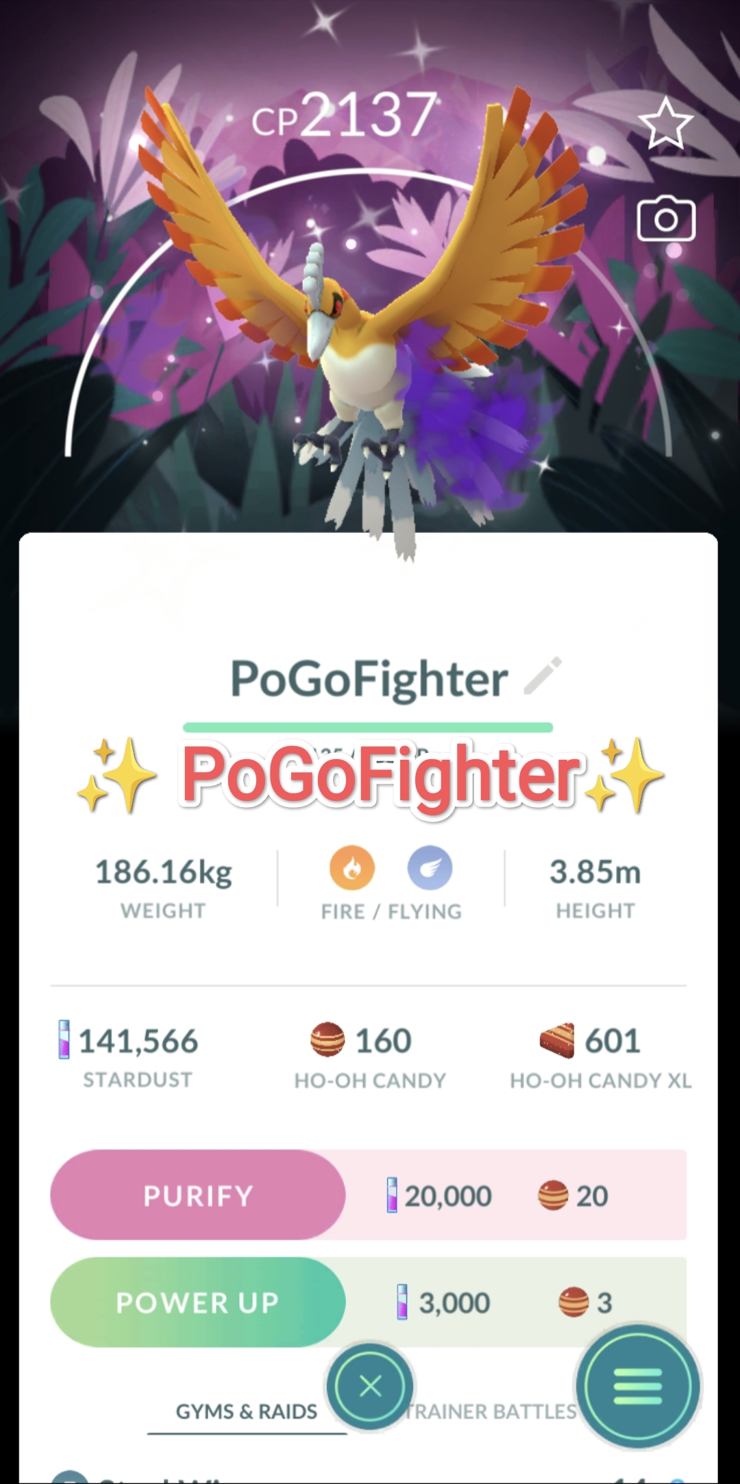 Pokémon GO Shiny Ho-Oh (Purified) with Special Background – Into the Wild – Trade 20.000 stardust (Read Describe)